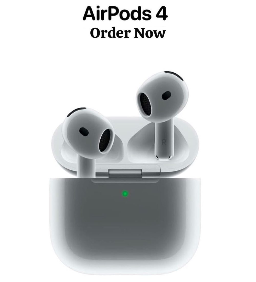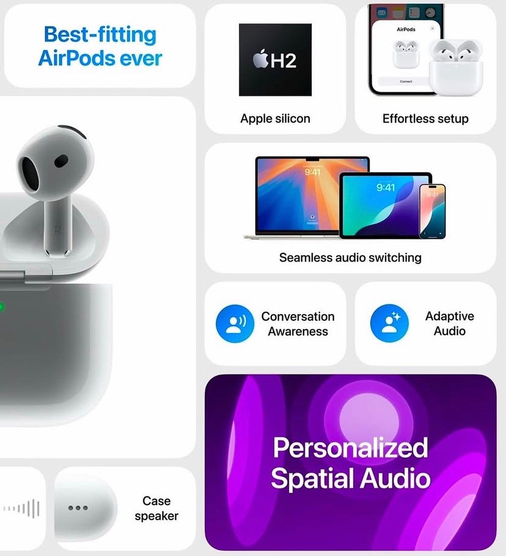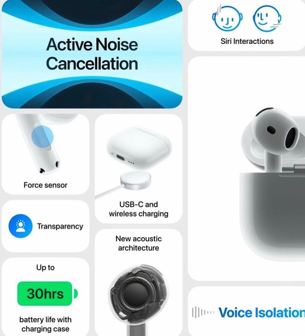 - Redesigned for exceptional fit and audio performance — and available with Active Noise Cancellation, Adaptive Audio and Transparency mode for the first time in this design. The powerful H2 chip delivers clearer calls with Voice Isolation, the magic of Conversation Awareness and a new, hands-free way to interact with Siri. Footnote ⁵ Personalised Spatial Audio with dynamic head tracking places sound all around you. Footnote ⁴ Rated IP54 dust, sweat and water resistant. Footnote ¹¹ USB-C charging and up to 30 hours of listening time using the case. Footnote ¹⁵ The charging case includes a built-in speaker for Find My to help you locate your AirPods 4. Footnote ⁸ The case also supports wireless charging with an Apple Watch charger or Qi-certified wireless chargers.
